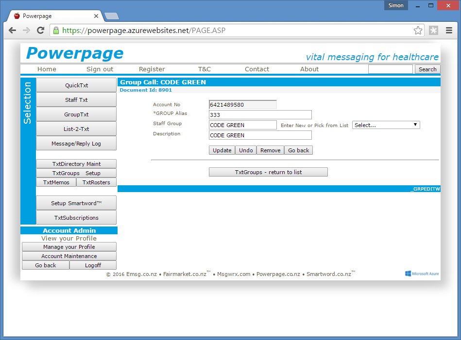 TIP: Setup all your TxtGroups in advance, then they can be selected from the drop-down listbox in staff maintenance.